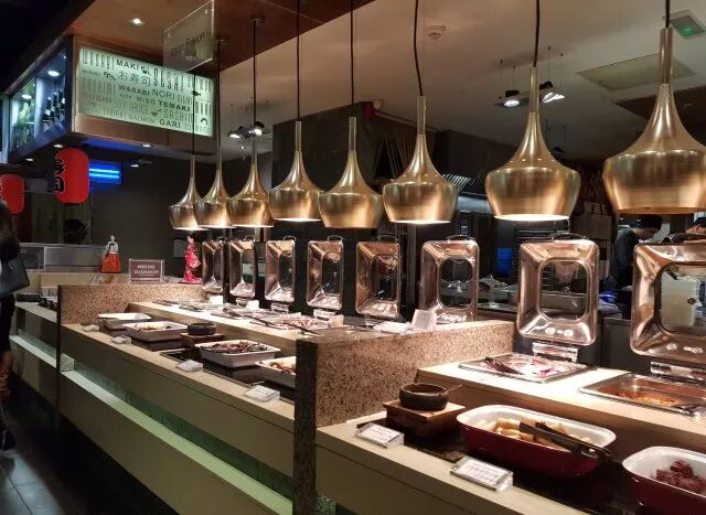 餐厅共两层,上层自助餐,下层自助火锅,自助火锅同时还可自由拿取自助餐
