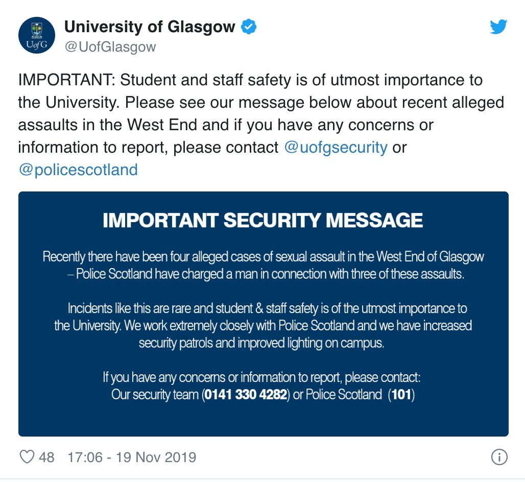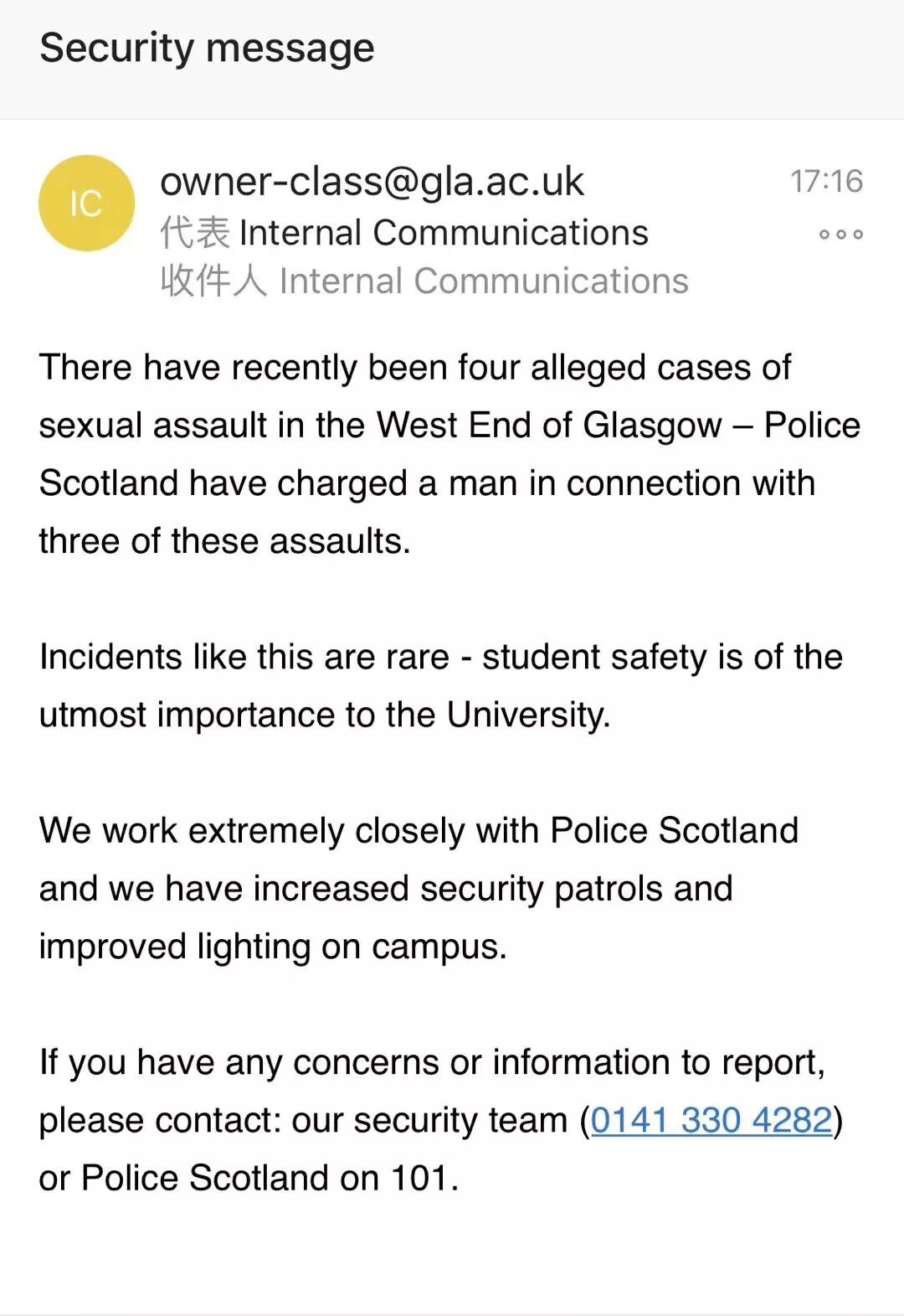 请所有格拉斯哥的同学们,一定要注意自己的安全