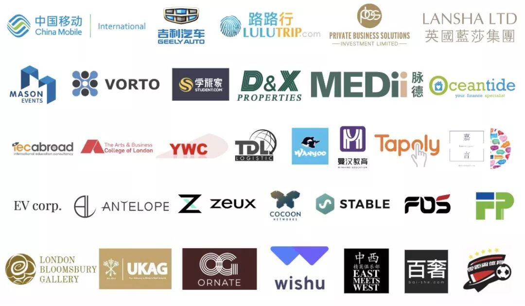 包括中国移动国际公司英国分公司、蓝莎集团、路路行旅游、PBS、依图科技、欧泰盛德、华丽集团、普德精英、百奢、吉利、足球零距离、学旅家、曼汉教育、网鱼、脉徳、CareerVantage职势, Cocoon Global, YWC Accountants, EV Group, Vorto Trading, Mason Events, Tapoly, D&X Properties, FDS, IEC, Wishu, The Arts & Business College of London, Zeux, Bloomsbury Gallery,TDL……