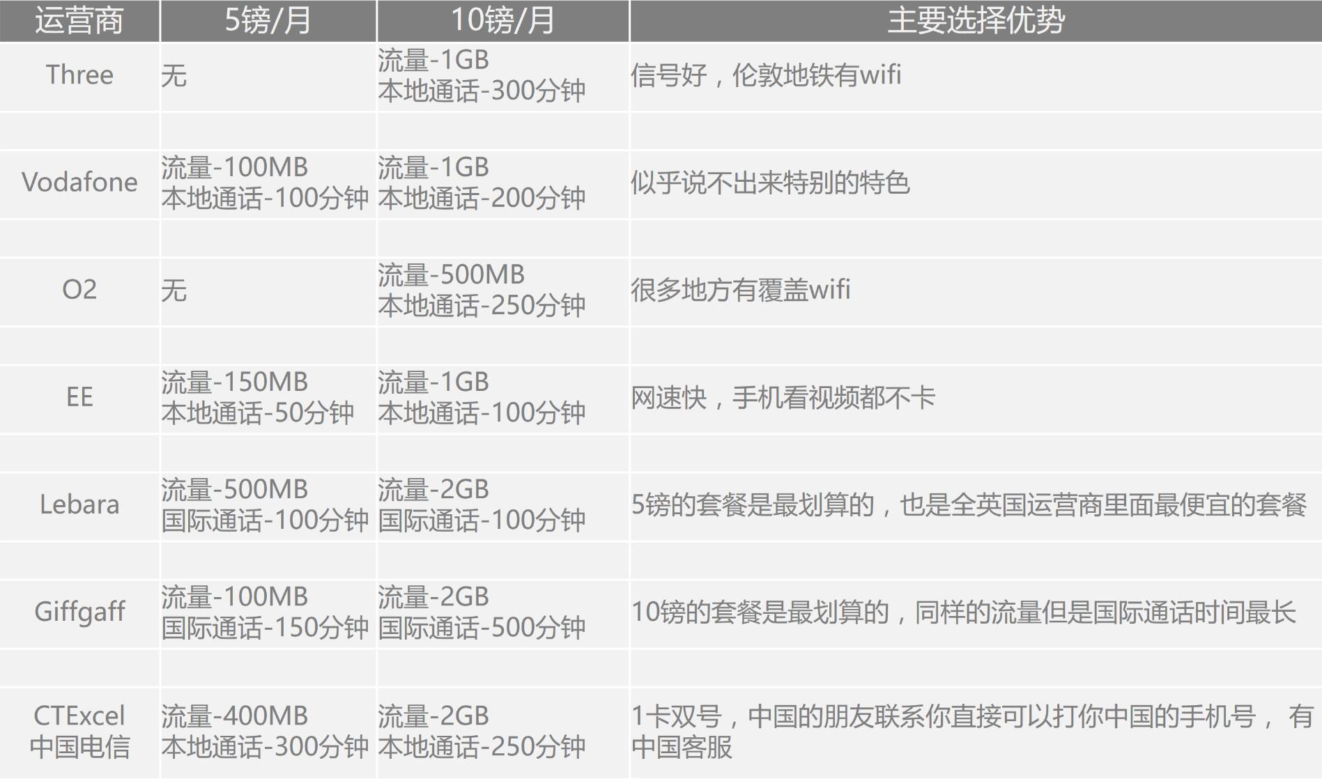 英国有很多的运营商,每一家都有自己的特色,比如说君君的妈妈特别爱查岗,所以果断选择了中国电信的卡,看看你自己需求是什么吧,根据自己的需求选择最好。以下图标可是君君原创哦,进整理了5镑与10镑的套餐给大家, 其他的还有很多,我就不给大家全部介绍了。