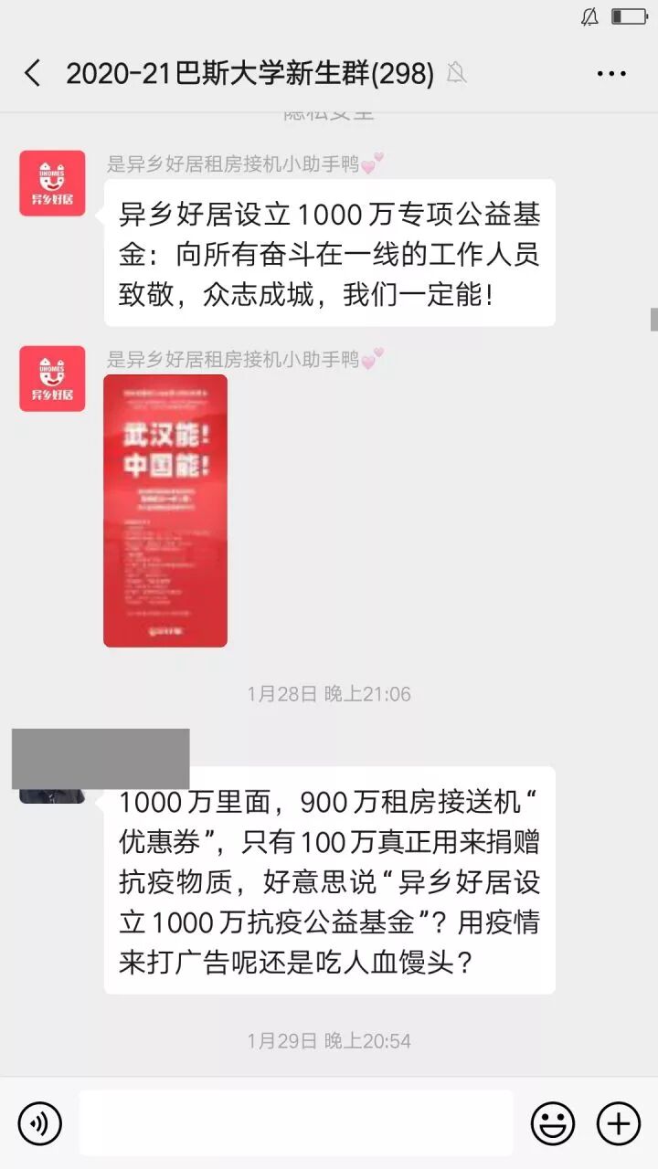按照异乡X居官方说法,这1000万抗疫公益基金里面有100万用于医疗物资采购捐赠,但我又想问,这100万的物资捐了吗?我希望是已经真的捐了,真的帮到了那些需要帮助的人。刚刚在微博上看到异乡X居的员工发了这个视频,但视频上并没有异乡好居的 LOGO,不知道是人家采购完忘记印了,还是异乡把人家物资拿过来代表人家做个捐赠,做个过路神仙,正所谓“我参与,你奉献,我快乐”。
