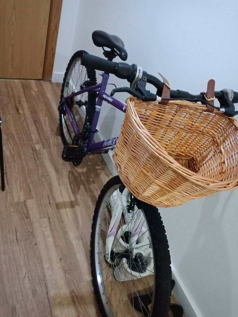 紫色自行车,有篮子(可拆)。附送自行车锁和 自行车加风器。全新 无瑕疵